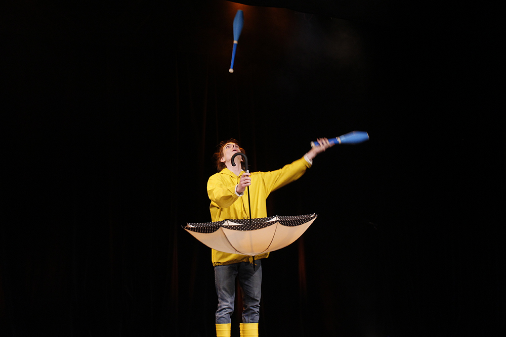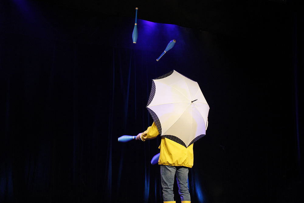 Rainy day Another rainy day… Hidden under his umbrella, he waits for a bit of sun so he can play, before the rain comes back again. A poetic and metaphoric moment, where juggling clubs melt into water drops. Duration : 5 minutes